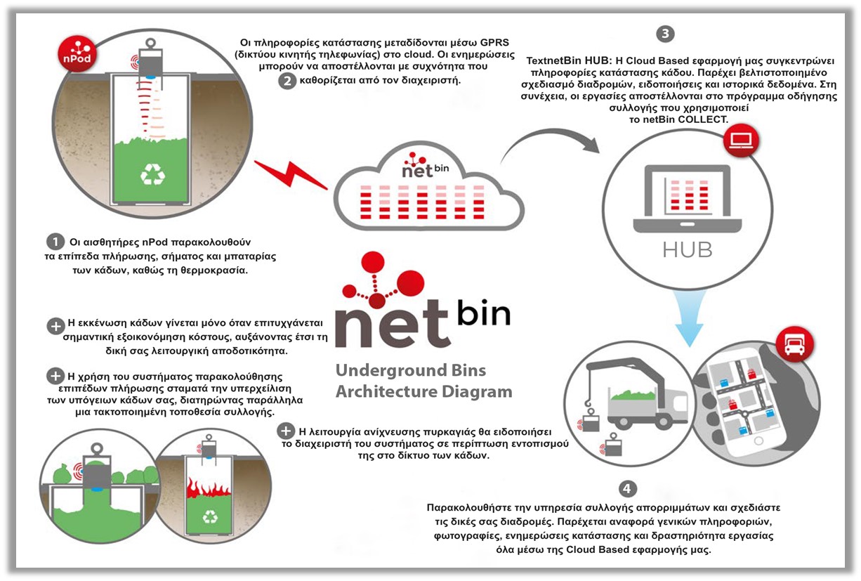 The bins are equipped with a monitoring system for their fullness, consisting of sensors and accompanied by a software application for transmitting measurements, which is accessible via the internet for data management.